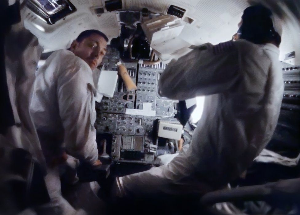 На созданном из кадров видеопленки панорамном снимке в лунном модуле видно, как командир экипажа Ловелл выбирает магнитофонную кассету с музыкой. Пилот Суайгерт, тем временем, решил вздремнуть.
