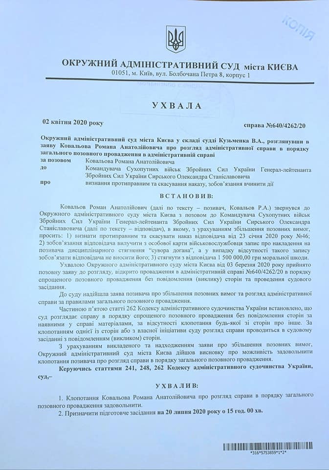 Окружной административный суд Киева решил рассматривать резонансное дело офицера ВСУ Романа Ковалева в общем, а не упрощенном порядке.