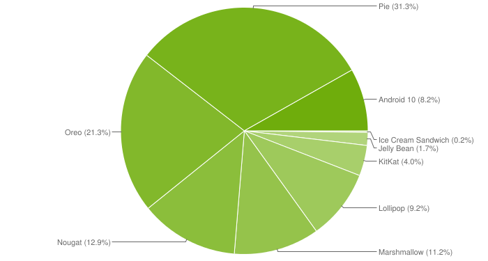Android Pie с долей 31,3% на сегодняшний день является самой популярной версией мобильной операционной системы Google. На втором месте по распространенности идет Android Oreo с суммарной долей 21,3%. На четвертом находится Android Nougat. Она установлена на 12,9% всех соответствующих устройств. На долю Android Marshmallow приходится 11,2%, Lollipop занимает 9,2% рынка, KitKat — 4%, Jelly Bean — 1,7%, а Ice Cream Sandwich — по 0,2%.
