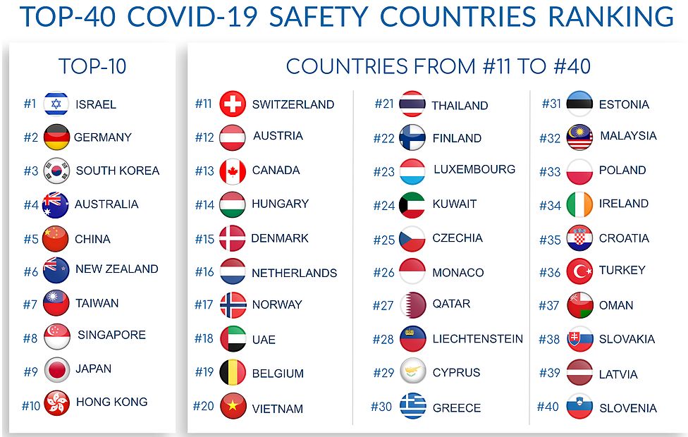 Государство Израиль возглавило рейтинг безопасности стран в условиях пандемии коронавируса. На втором и третьем местах — Германия и Южная Корея.