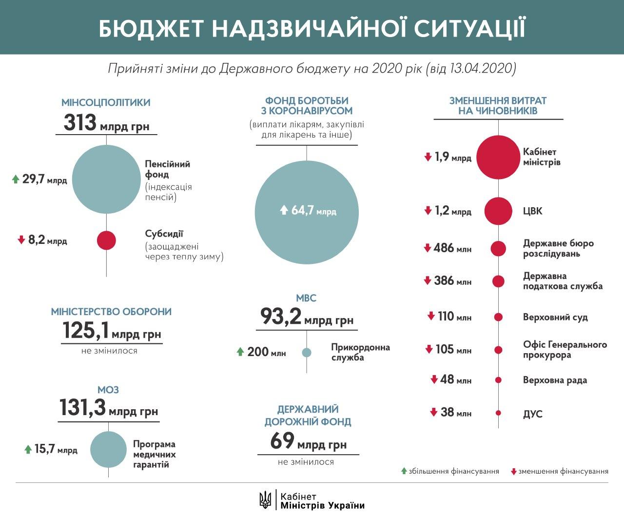 Согласно закону, в составе госбюджета образуется Фонд борьбы с коронавирусом в объеме 64,7 млрд грн. Эти средства будут направлены на первоочередные и приоритетные направления противодействия распространению COVID-19.