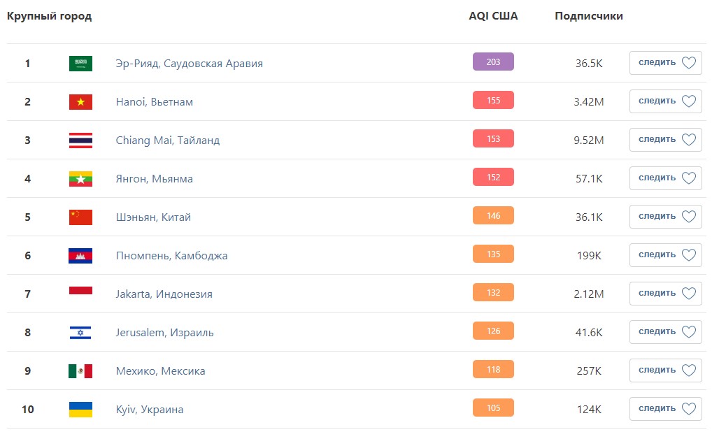 На первом месте мирового антирейтинга - Эр-Рияд в Саудовской Аравии (203), на втором - Hanoi, Вьетнам (155), а на третьем - Chiang Mai, Тайланд (153).