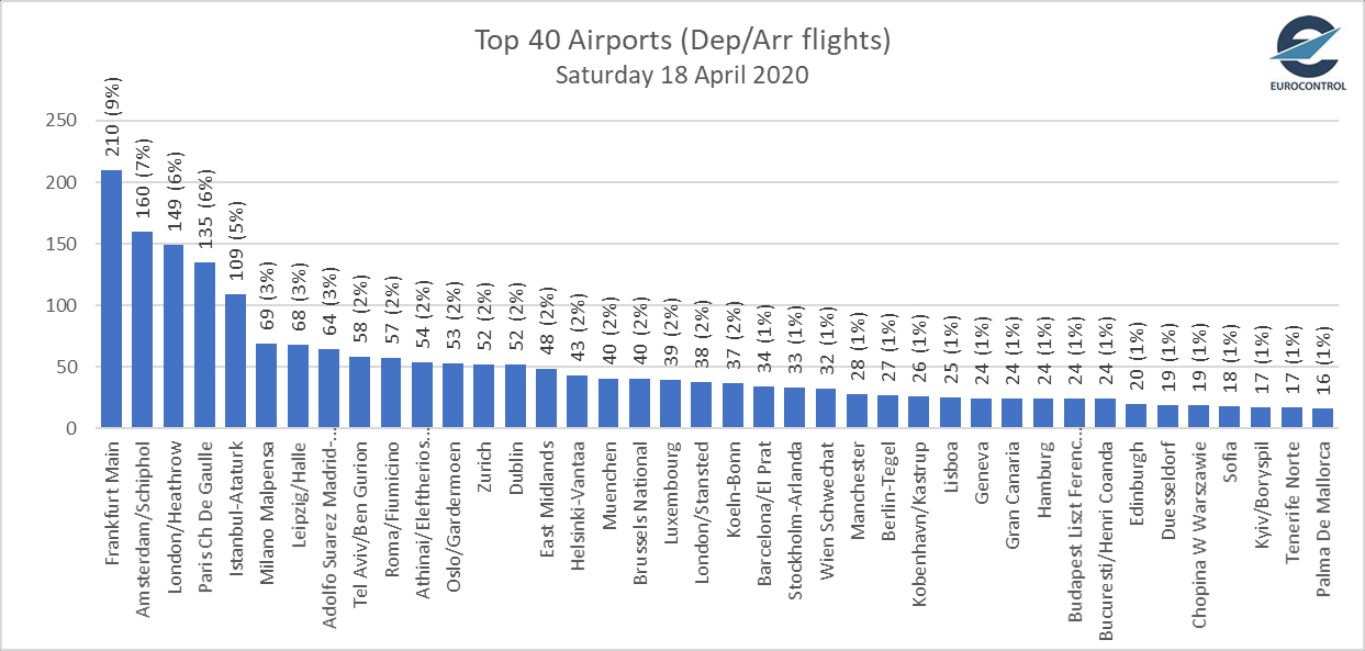 Крупнейшим аэропортом Европы в условиях карантина стал Франкфурт. Предприятие 18 апреля обслужило 210 рейсов, что составляет 9% от его обычного трафика. На втором месте оказался амстердамский Схипхол в результатом 160 рейсов (7%). Третью строку занял лондонский Хитроу, обслуживший 149 рейсов или 6% от своего обычного объема.