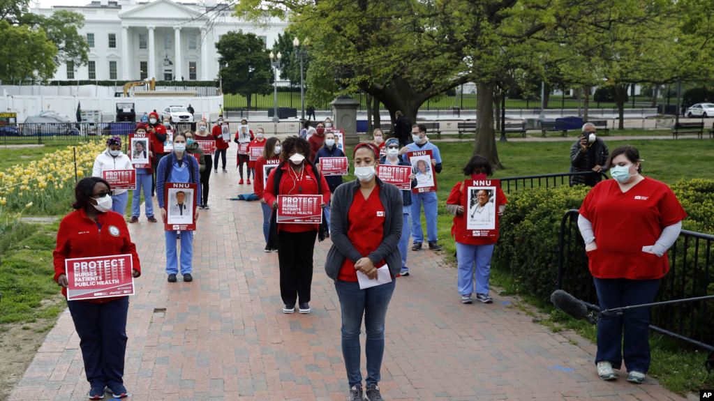 Несколько медсестер и медбратьев вышли на акцию протеста у Белого дома, потребовав, чтобы администрация закупила дополнительные средства индивидуальной защиты.