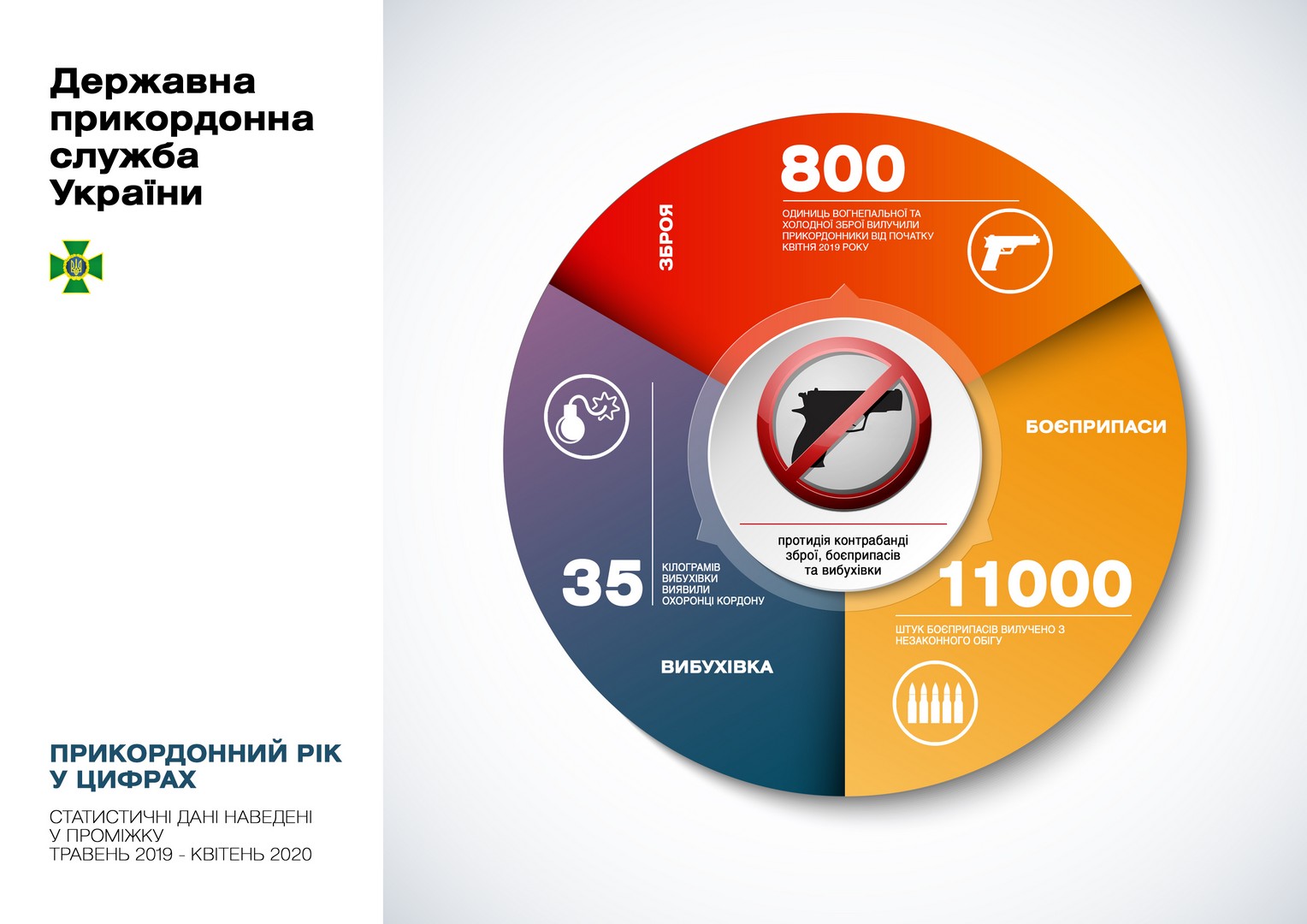 Від початку квітня 2019-го на державному кордоні України, лінії розмежування в зоні проведення ООС та на адмінмежі з ТОТ АР Крим співробітники Держприкордонслужби виявили та вилучили 800 одиниць зброї як вогнепальної, так і холодної, майже 11 тисяч боєприпасів та 35 кг вибухівки. Окремо варто зазначити, що чимала кількість затримань відбулась завдяки чіткій роботі оперативних підрозділів, а також за їх інформацією. Крім того, оперативники Держприкордонслужби зі складу Об’єднаних сил продовжують активну протидію можливим ворожим диверсіям, переміщенню зброї та обладнанню схронів незаконних збройних формувань.