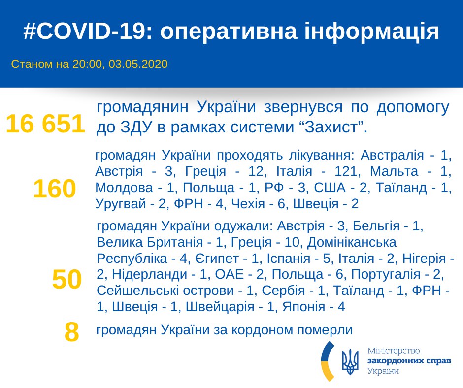 По состоянию на 3 мая за границей на лечении от коронавирусной инфекции находятся 160 граждан Украины. Об этом сообщает Министерства иностранных дел Украины.