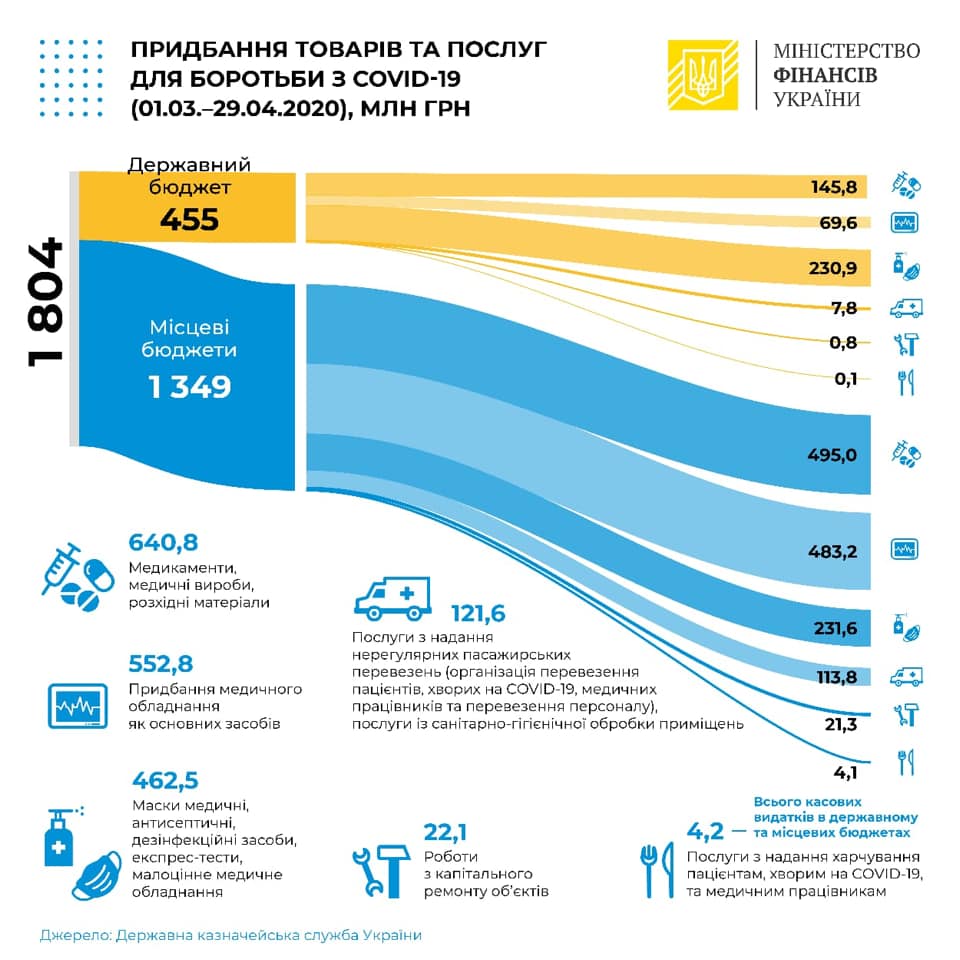 По данным Госказначейства, с 1 марта до 29 апреля 2020 года включительно, за счет бюджетов всех уровней проведено платежей на сумму 1,8 млрд грн, в том числе 455 млн грн средств госбюджета и 1 349 млн грн средств местных бюджетов.