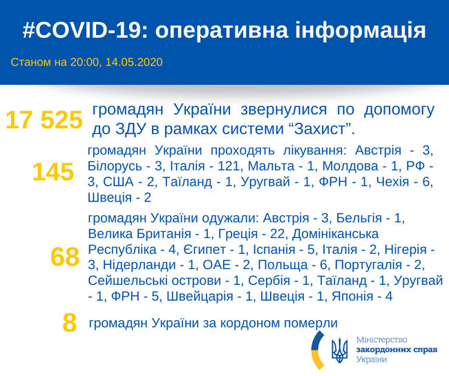 За рубежом по состоянию на 15 мая лечение от коронавирусной инфекции проходят 145 граждан Украины.