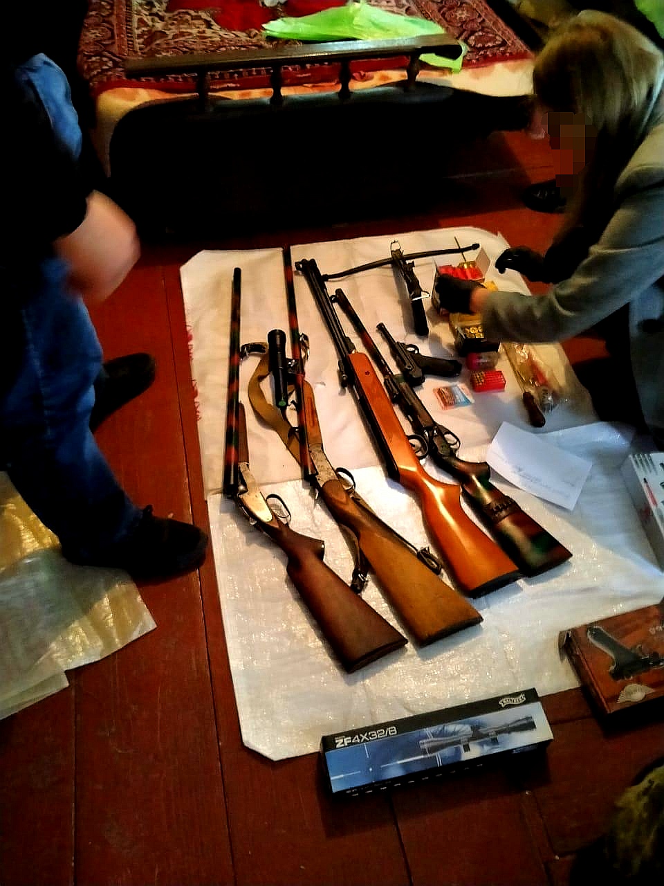 По месту жительства гражданина Украины правоохранители обнаружили 2 охотничьих гладкоствольных ружья, малокалиберную нарезную винтовку, пневматический пистолет, пистолет-арбалет, прицел оптический, патроны охотничьи в количестве 37 штук и 17 патронов боевых к малокалиберной нарезного оружия.