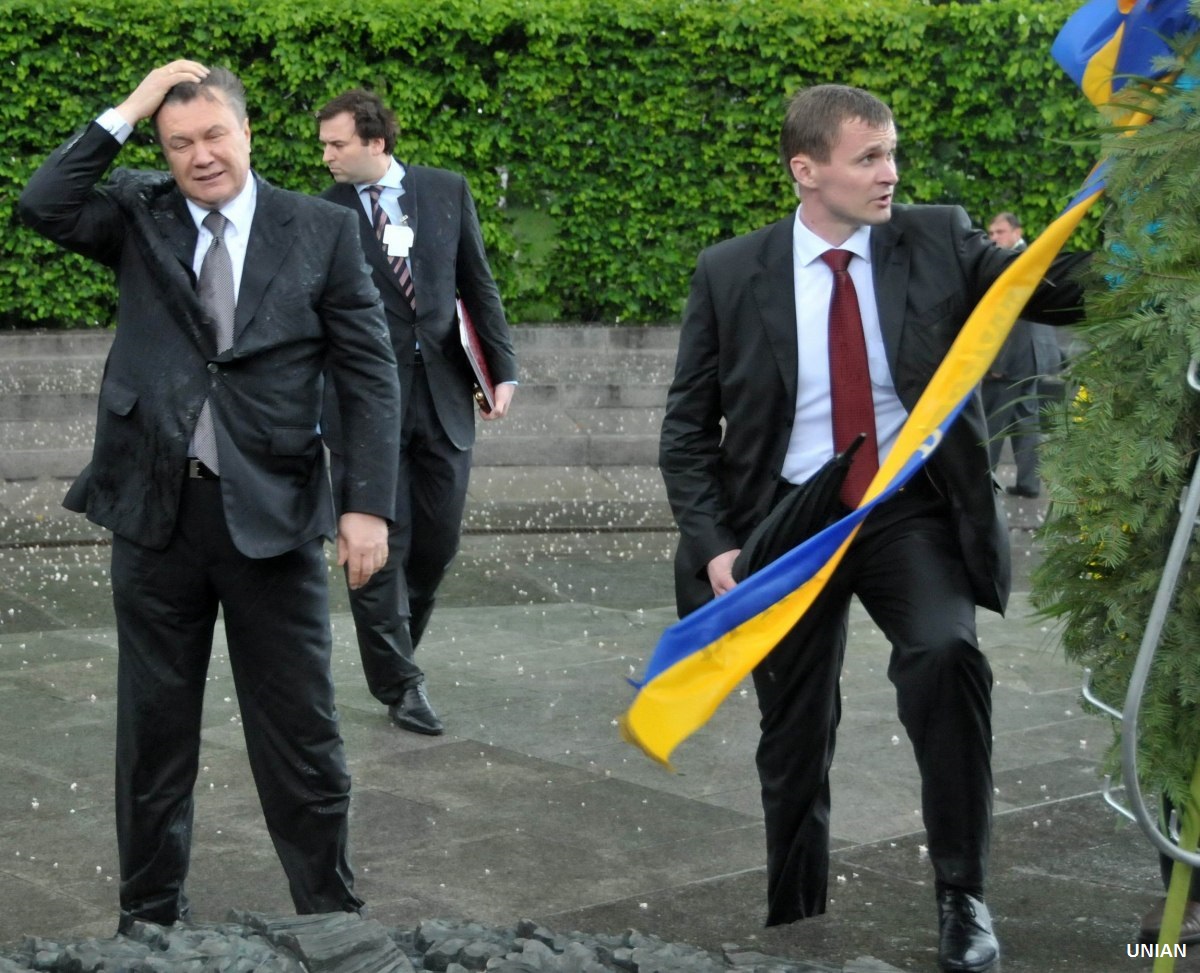 В парке Славы венок придавил тогдашнего президента Украины Виктора Януковича. Напомним, что произошло это необычайно зрелищное событие во время визита в Киев Дмитрия Медведева, который в 2010 году занимал в России должность главы государства.