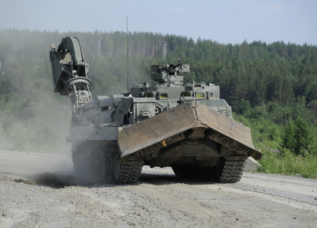 На машину также могут быть установлены гидравлический молот для разрушения бетонных конструкций или стрела с универсальным экскаваторным ковшом. Военные намерены использовать новую машину для прокладывания колонных путей, подготовки дорог, засыпки рвов и воронок, организации съездов в оврагах или на берегах и многих других инженерных работ.