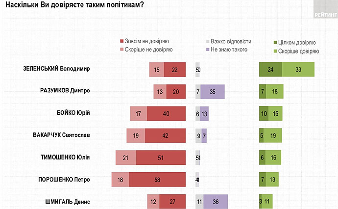 "Юрию Бойко (ОПЗЖ) доверяют 25%, не доверяют – 57%, Святославу Вакарчуку – 24% и 61% соответственно, Юлии Тимошенко – 22% и 72%, Петру Порошенко – 20% и 76%".