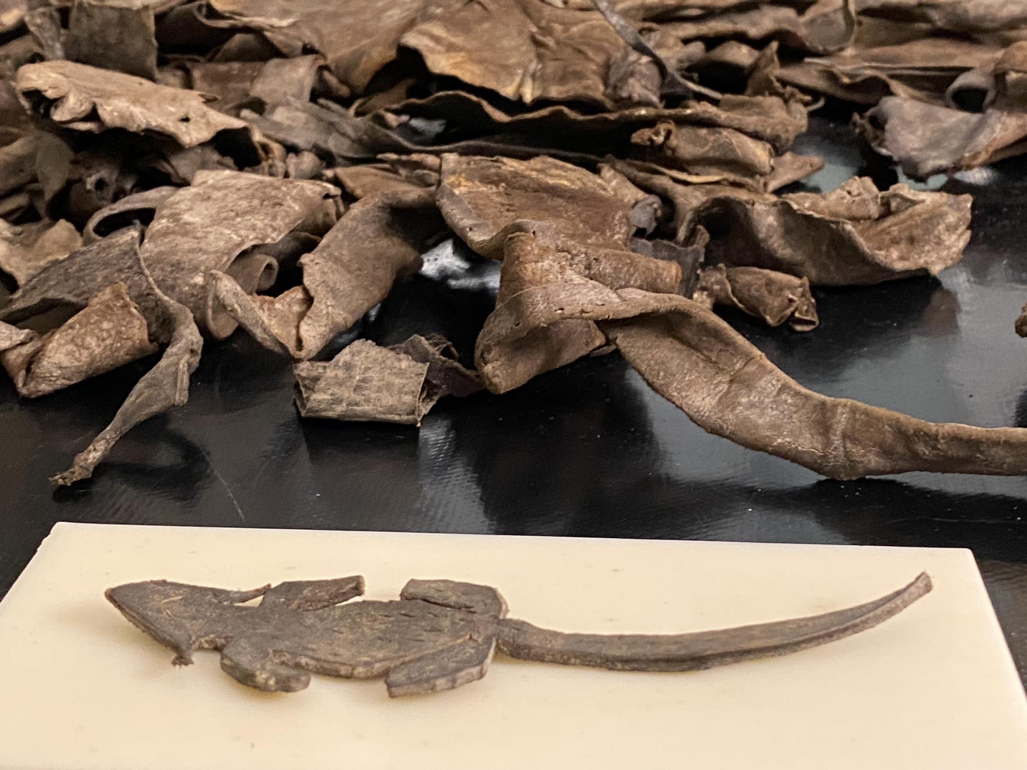 Изделий из кожи в Виндоланде тоже найдено уже немало. Как и в случае с деревянными предметами, их сохранность обеспечила влажная болотистая почва. Там есть полотна от воинских палаток, заплатки, сумки, обувь, а также множество обрезков — отходов производства, которые даже не выставляются в музее. Пересматривая коробку с такими обрезками, найденными в жилище одного из командиров крепости еще в 1993 году, работники музея обнаружили, что один из них представляет собой фигурку с хвостом и четырьмя ногами. Они сначала подумали, что он изображает ящерицу, но при подробном рассмотрении заметили черточки на теле, которые обозначают шерсть.