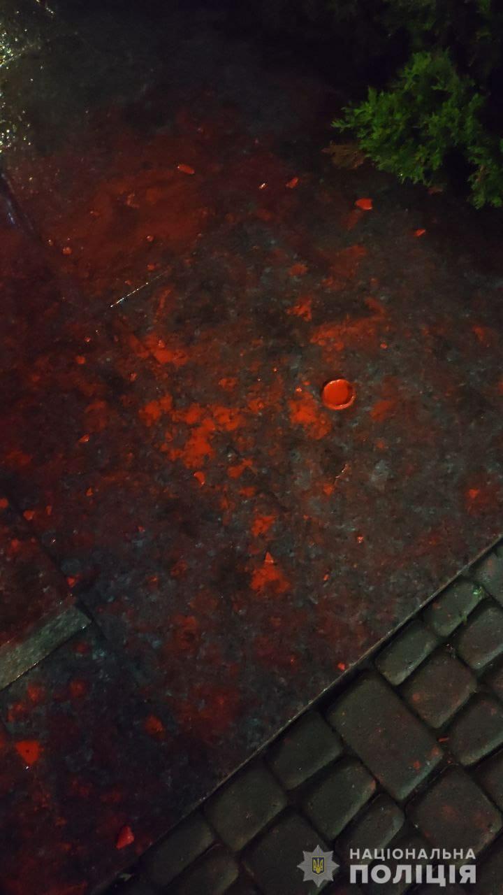 Как сообщили в отделе коммуникации полиции Харьковской области, на месте происшествия была изъята разбитая стеклянная банка с остатками краски.