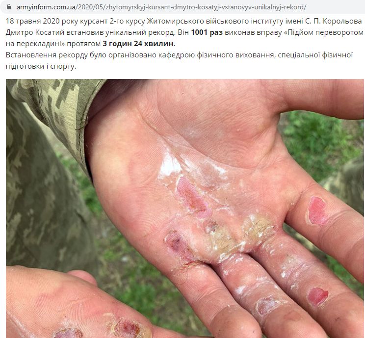 18 мая 2020 курсант 2-го курса Житомирского военного института имени С. П. Королева Дмитрий Косатый установил, как утверждает информагентство Минобороны, "уникальный рекорд".