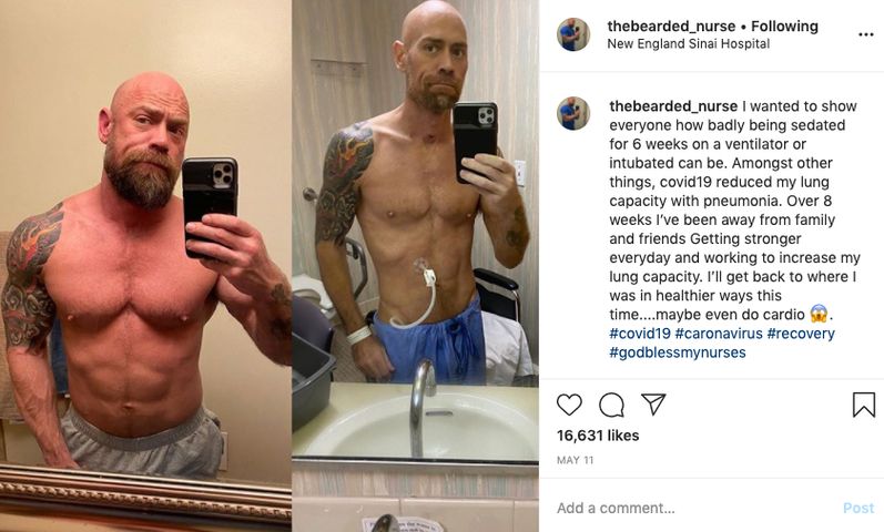 Шульц поделился фотографией, наглядно демонстрирующей то, что COVID-19 сделал с его телом, опубликовав фото в своем инстаграм-аккаунте с 30 000 подписчиками. Снимок слева был сделан примерно за месяц до того, как он заболел. Фото справа сделано в больнице на этапе выздоровления. По его словам, мужчина был измучен даже тем, что ненадолго встал с кровати, чтобы сфотографироваться.