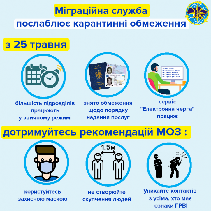 Відповідно до рішення Уряду, з 25 травня Державна міграційна служба України послаблює обмеження, встановлені у зв’язку із запровадженням в Україні карантину.