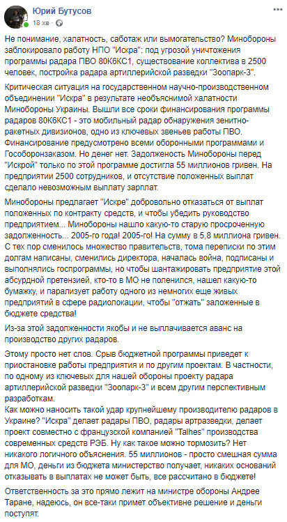 "И чтобы убедить руководство предприятием... Минобороны нашло какую-то старую просроченную задолженность... 2005-го года! 2005-го! На сумму в 5,8 миллиона гривен. С тех пор сменилось множество правительств, тома переписки по этим долгам написаны, сменились директора, началась война, подписаны и выполнялись госпрограммы, но чтобы шантажировать предприятие этой абсурдной претензией, кто-то в МО не поленился, нашел какую-то бумажку, и парализует работу одного из немногих еще живых предприятий в сфере радиолокации, чтобы "отжать" заложенные в бюджете средства! Из-за этой задолженности якобы и не выплачивается аванс на производство других радаров", - сообщает Бутусов.