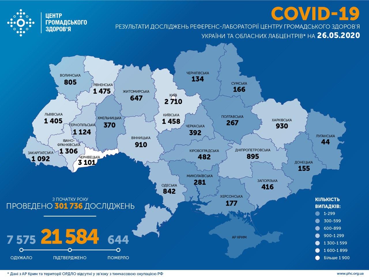 По данным Минздрава, по состоянию на 9:00 26 мая в Украине 21584 лабораторно подтвержденных случаях COVID-19, из них 644 летальных, 7575 пациентов выздоровели. За сутки зафиксировано 339 новых случаев.