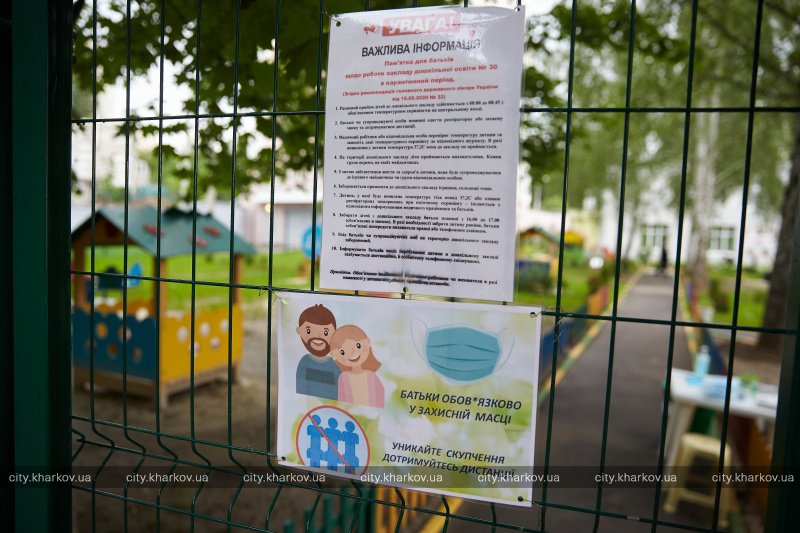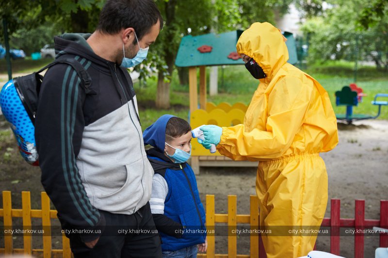 Среди прочих открылся детский сад №30 на Алексеевке. Дошкольное учебное учреждение работает с некоторыми изменениями. На входе детей встречает медицинская сестра Елена Чирвон в защитном костюме, которая измеряет им температуру, дезинфицирует руки, подошву обуви, рюкзаки, самокаты и игрушки, если такие есть. После этого ребенок снимает маску и, если она одноразовая, выбрасывает ее в спецконтейнер, который стоит рядом. Потом дети прощаются с родителями и идут с воспитателями дальше в детсад.