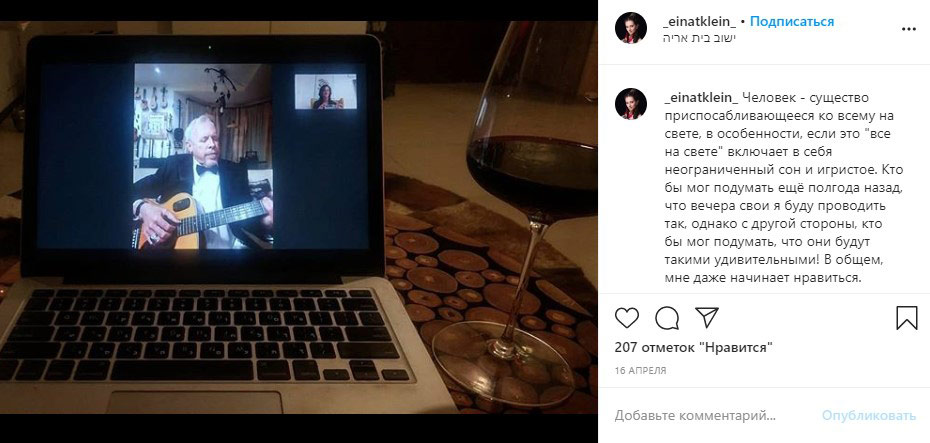 В настоящее время Эйнат Кляйн находится в Израиле, а Андрей Макаревич - в России. Карантин на какое-то время разлучил их. Эйнат должна была прилететь к музыканту, но все рейсы отменили. "Теперь общаемся в Zoom и ждем, когда появится возможность встретиться", - сообщил Макаревич.