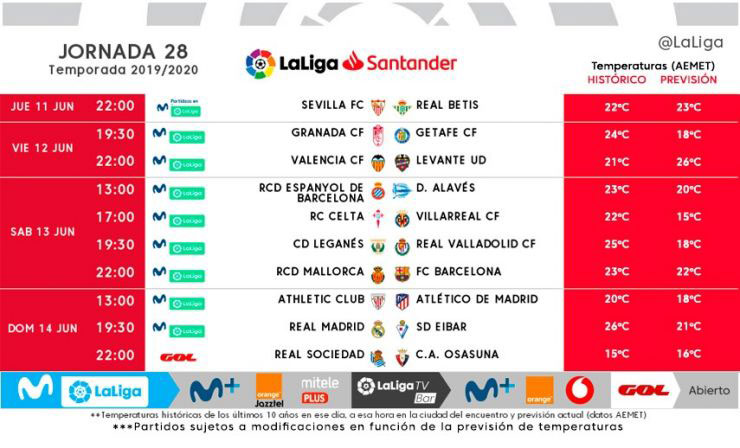Согласно расписанию, «Барселона», лидирующая в турнирной таблице, свой первый матч после паузы проведет 13 июня в гостях против «Мальорки». Мадридский «Реал», составляющий каталонцам конкуренцию за победу в первенстве, 14 июня дома сыграет с «Эйбаром».
