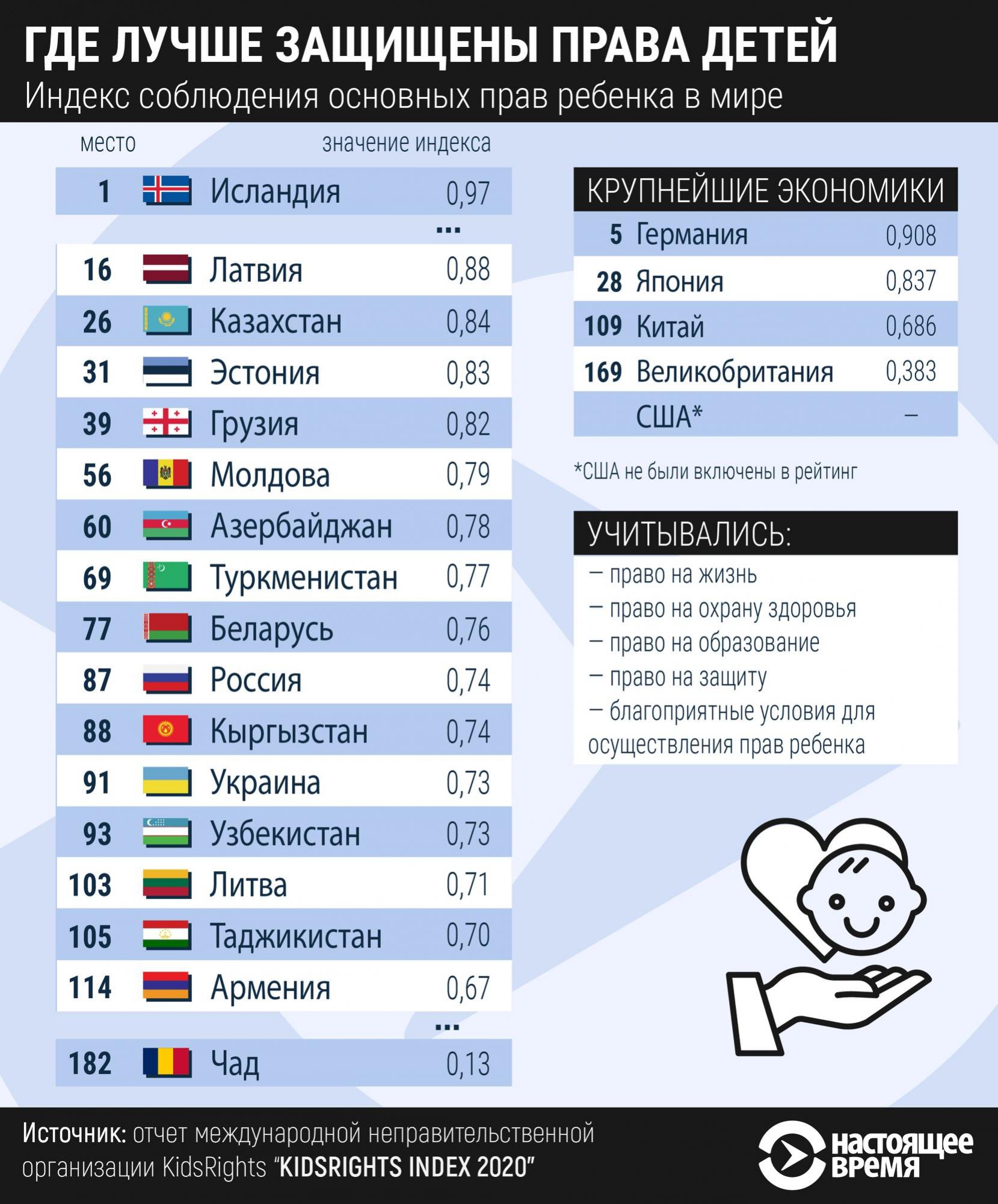 Рейтинг, который организация KidsRights Foundation с 2013-го ежегодно составляет в преддверии Международного дня защиты детей, оценивал положение дел в 182 странах по пяти разным показателям. Они включали, в частности, доступ к образованию и здравоохранению и усилия властей по охране детских прав. С этой точки зрения самыми защищенными и благополучными признаны Исландия, Швейцария, Финляндия, Швеция и Германия.
