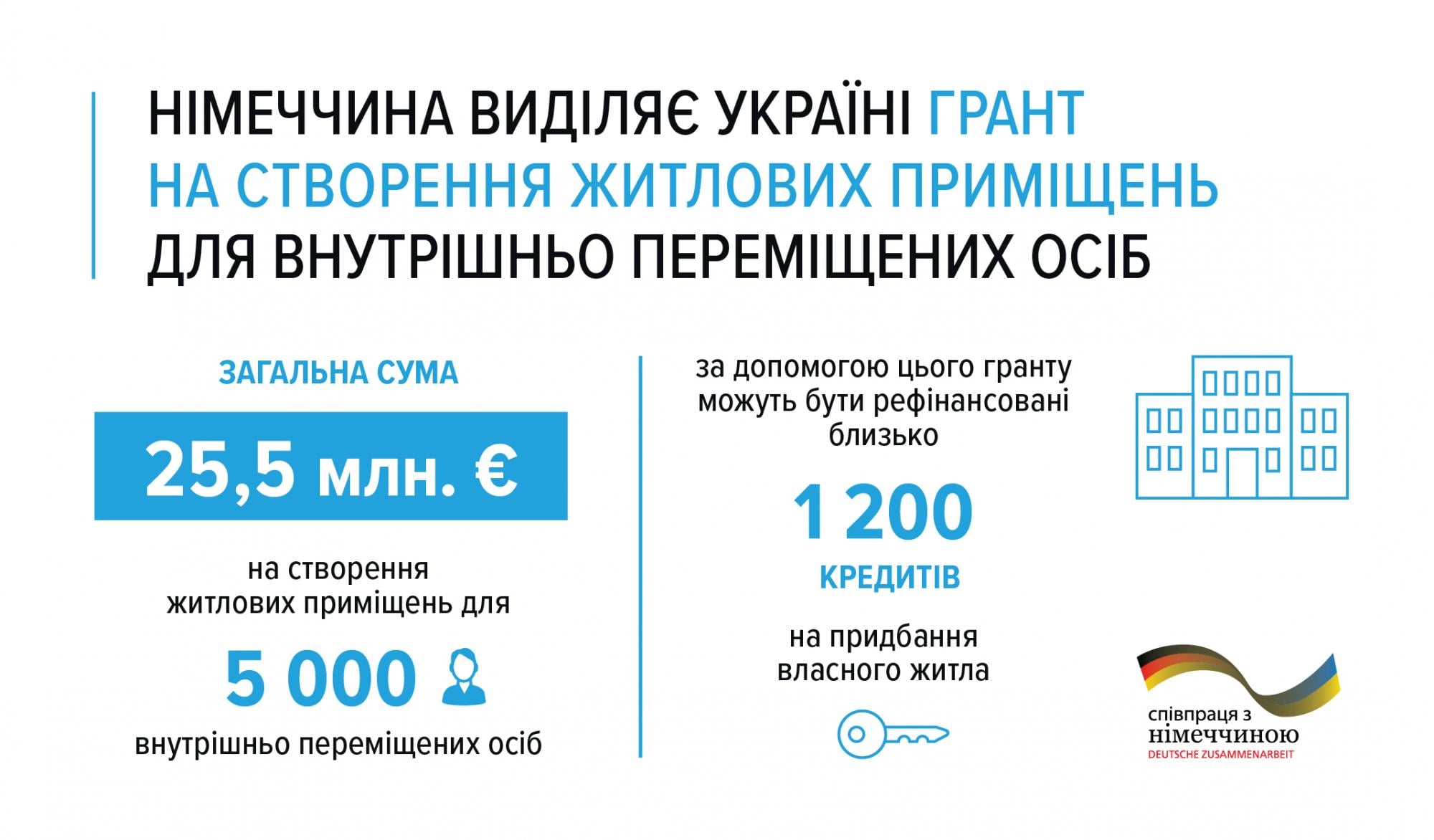 Так, в соответствии с Соглашением 25,5 млн евро предусмотрено направить на реализацию проекта "Жилые помещения для внутренне перемещенных лиц", целью которого является обеспечение жилыми помещениями украинцев, которые были вынуждены покинуть свои дома из-за вооруженной агрессии Российской Федерации.