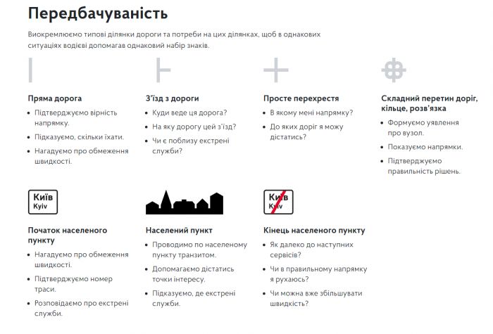 "Для построения такой большой системы, как автомобильная навигация, нужно определить принципы, которые помогают упорядочить все решения: знаки стоят в тех местах, где их ожидает увидеть водитель, и отвечают на те потребности, которые у него возникают. На всем пути знаки и принципы должны быть типичными и схожими. Пользование знаками должно быть удобным. Дорога должна давать информации больше, чем необходимо, и напоминать правила", - добавили в "Укравтодоре".