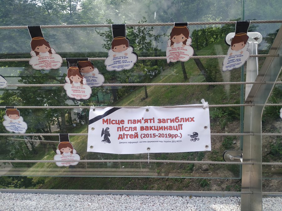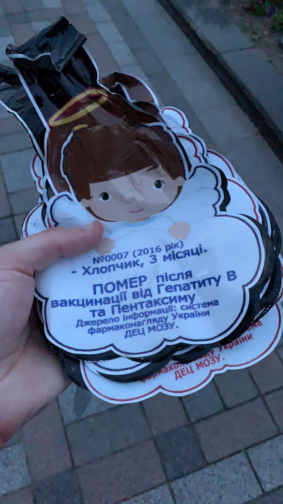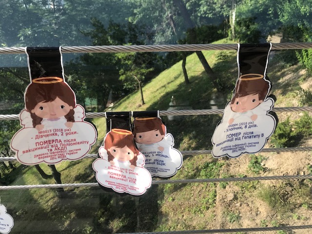 В центре Киева на пешеходно-велосипедном мосту через Владимирский спуск неизвестные развесили листовок с информацией о детях, которые умерли после вакцинации.