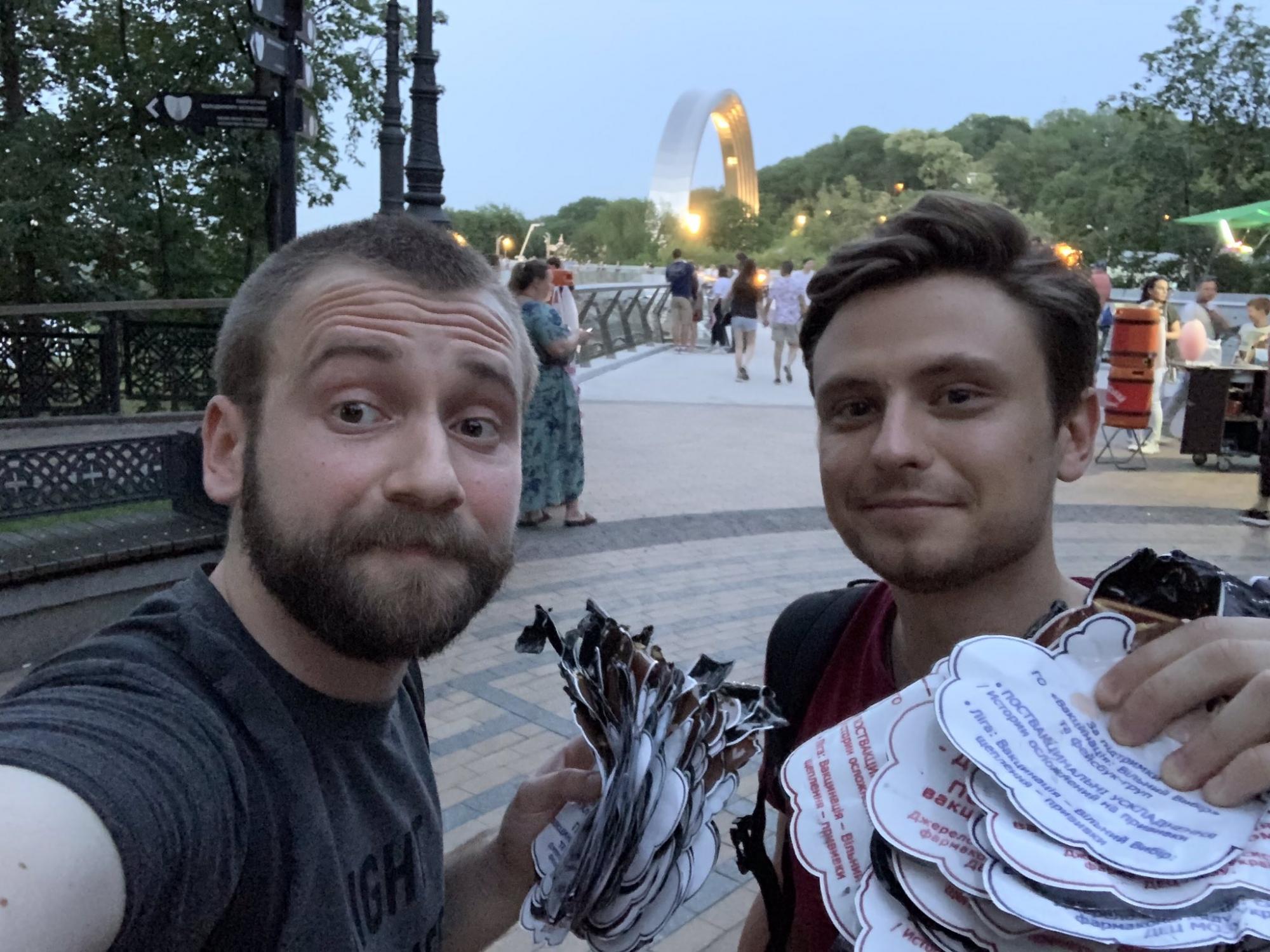 Позже активисты убрали листовки: "…антивакцинаторы вчера решили украсить стеклянный мост фейковой дичью... але всьо".