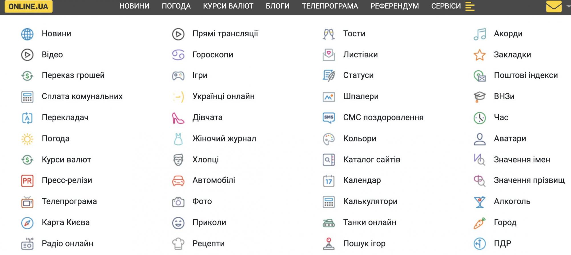 А еще - новости, погода, курсы валют, телепрограммы и… вот скришот предлагаемых сервисов от ONLINE.UA: