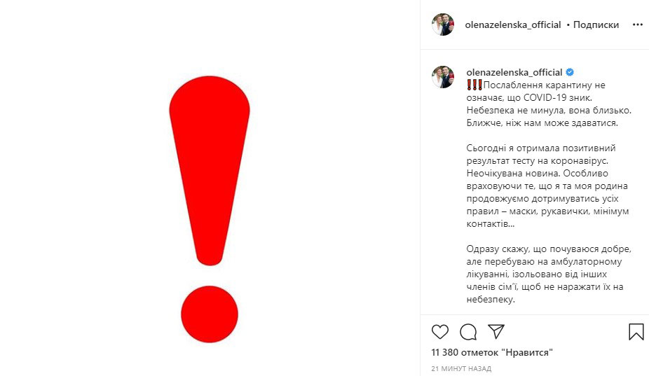 По словам госпожи Зеленской, она чувствует себя хорошо и находится на амбулаторном лечении, «изолированно от других членов семьи, чтобы не подвергать их опасности».