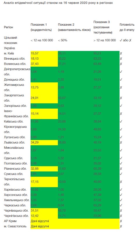 По состоянию на 15 июня Киев и десять областей Украины не отвечают всем необходимым критериям для ослабления карантинных ограничений.