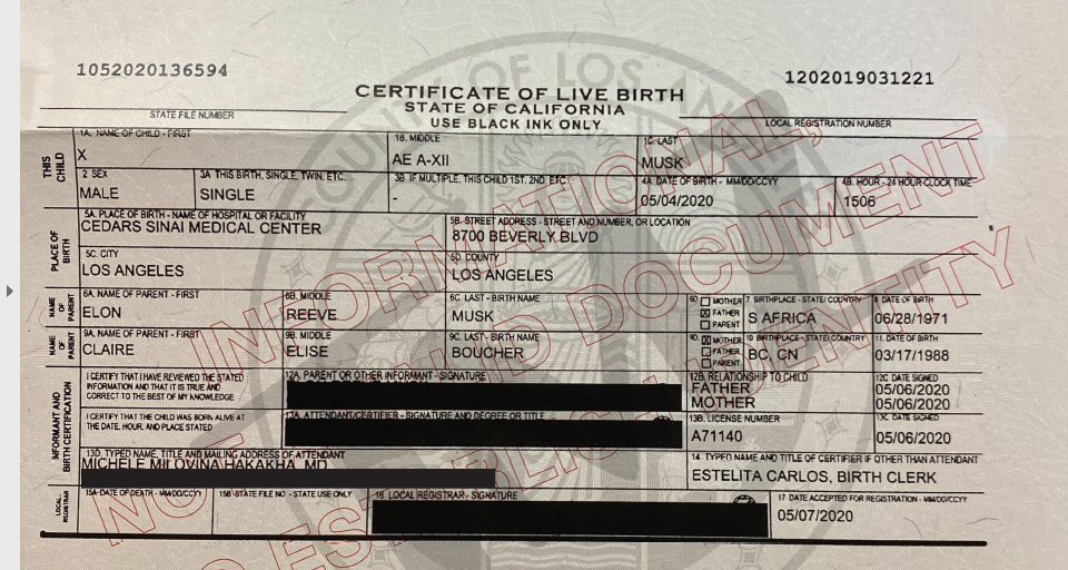 Согласно документу, имя сына теперь X AE A-XII Маск.