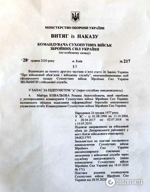 Об этом военнослужащий рассказал в эксклюзивном комментарии Обозревателю. Ковалев показал фото приказа об увольнении в связи со служебным несоответствием (чтобы посмотреть – доскролльте до конца страницы).