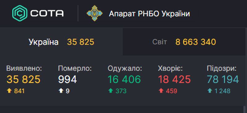 Количество новых случаев заболевания снизилось впервые с 14 июня. В течение последних шести дней заболеваемость выросла с 648 до 921 случая. Общее количество подтвержденных случаев инфицирования в Украине достигла 35 825.