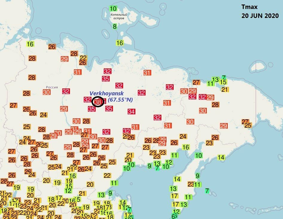 Французский метеоролог Этьен Капикян рассказал в Twitter, что 20 июня в сибирском городе Верхоянске температура поднялась до 38°C. Если данные подтвердятся, это станет самым высоким значением, когда либо зафиксированным к северу от Полярного круга.