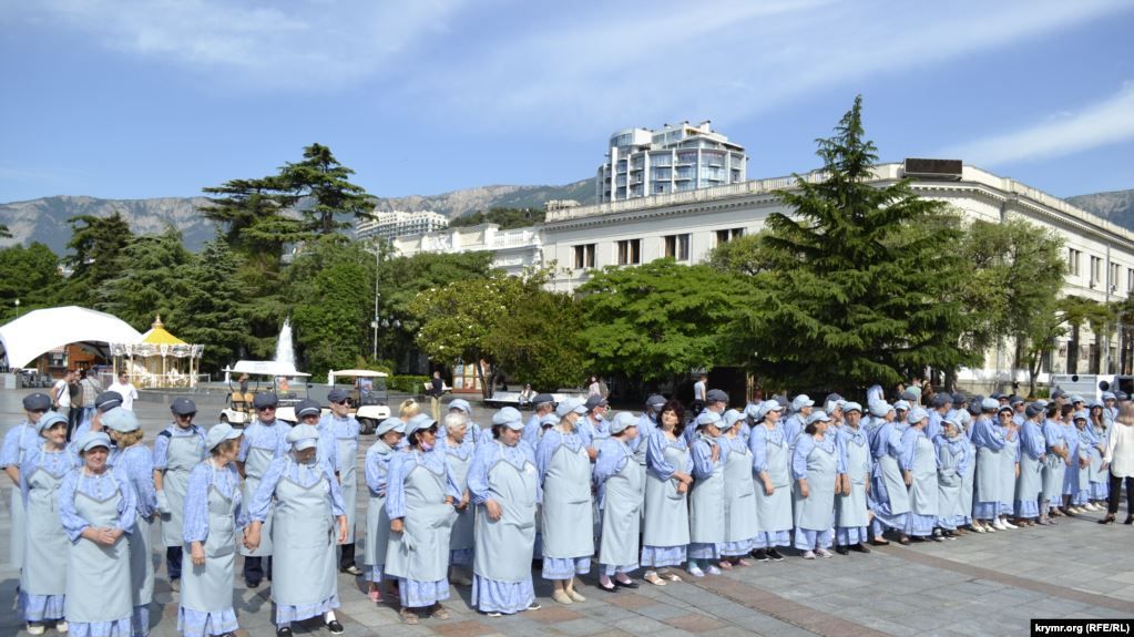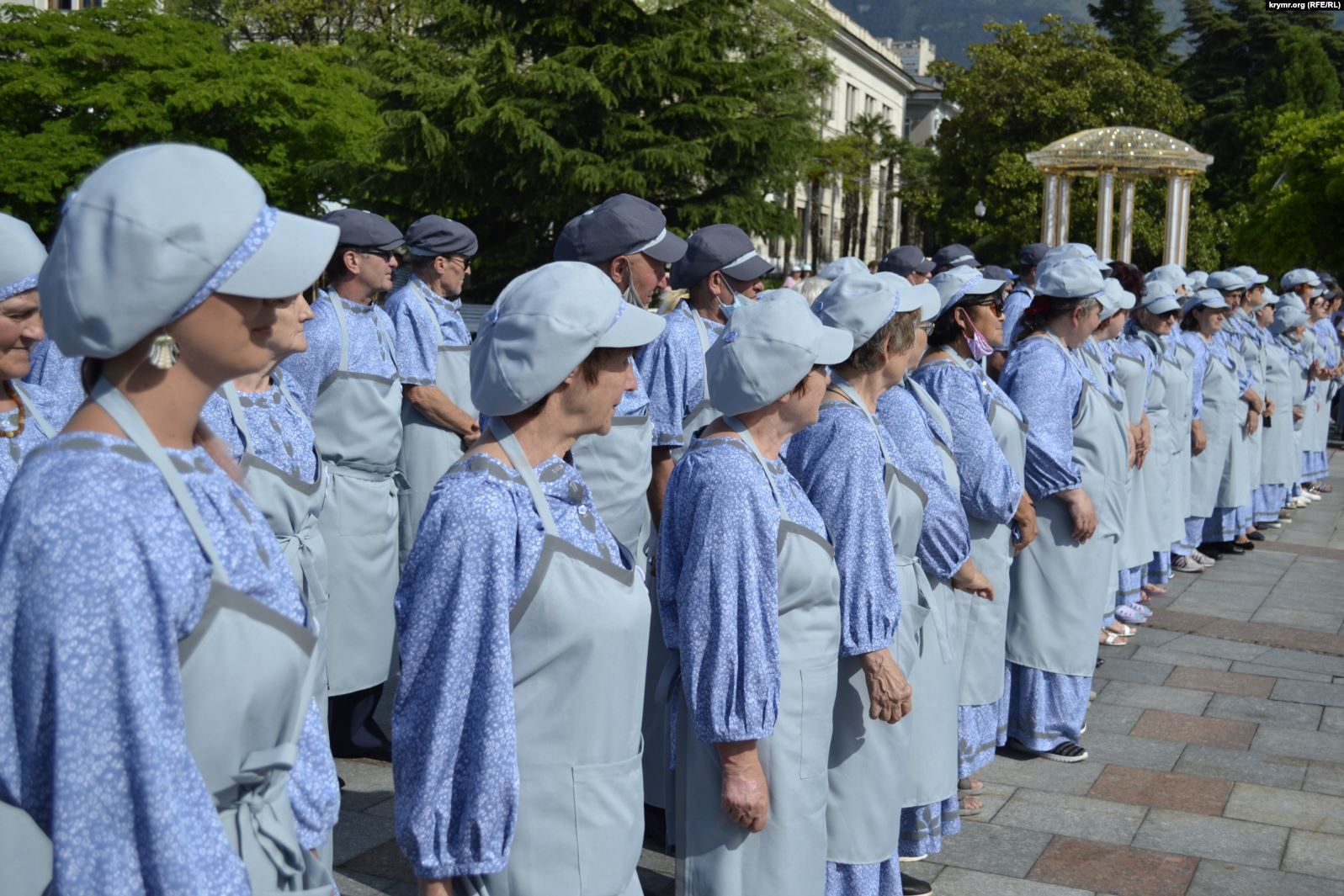 На городской набережной Ялты к «присяге» привели местных дворников. Работники давали «клятву чистоте» в новой, специально пошитой спецодежде, стилизованной в русском стиле ХIX века, сообщает Крым.Реалии.