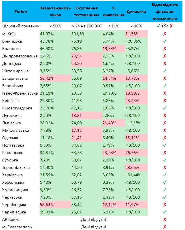 Четыре последних региона не соответствуют еще нескольким критериям. В частности в Закарпатской и Черновицкой областях на 58,43% и 53,64% соответственно заполнены койко-места в больницах при норме менее 50%.