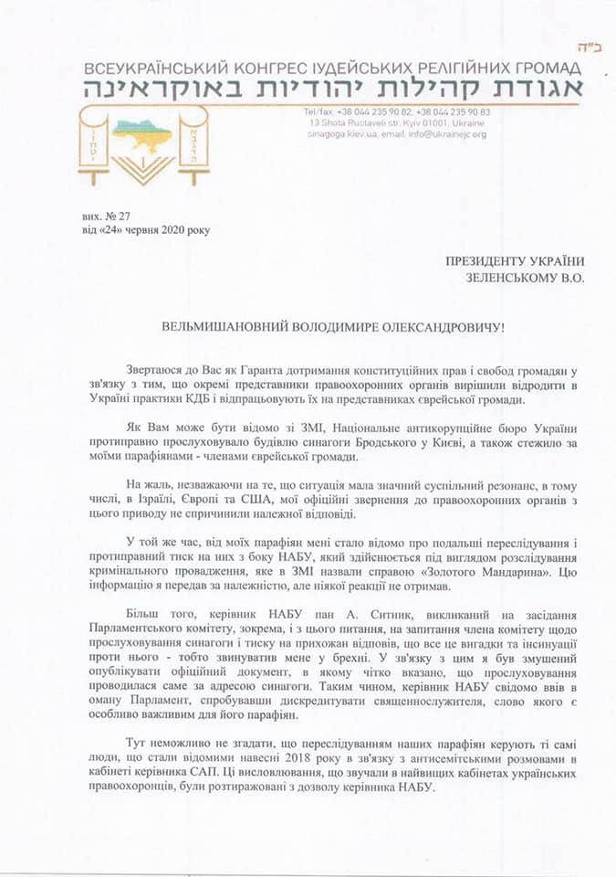 Соответствующее обращение к Президенту раввин Украины и Киева опубликовал на своей официальной странице в Фейсбук. Он просит взять под свой контроль ситуацию с преследованием и притеснением членов еврейской общины и помочь восстановить справедливость. Как заявил Моше Реувен Асман, Национальное антикоррупционное бюро Украины противоправно прослушивало здание синагоги Бродского в г. Киеве и следило за прихожанами – членами еврейской общины. Также он заявил о преследованиях и противоправном давлении на них со стороны НАБУ, которое осуществляется под видом расследования уголовного производства, называемого в СМИ делом «Золотого Мандарина».