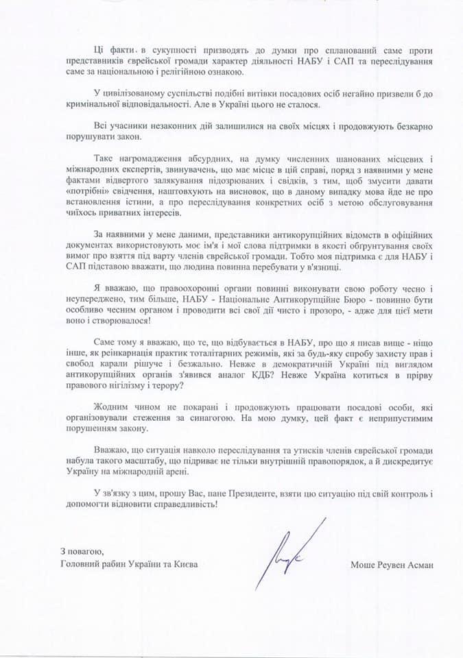 Раввин Украины и Киева Моше Реувен Асман просит Зеленского разобраться с преследованием и притеснением членов еврейской общины со стороны директора НАБУ Артема Сытника.