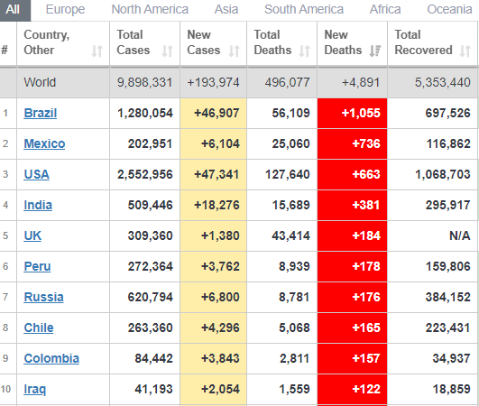 Всего за время пандемии в мире обнаружили 9 миллионов 903 тысячи случаев заболевания коронавирусной болезнью, из которых 496 тысяч – летальные. Побороли COVID-19 уже 5 миллионов 357 тысяч больных.