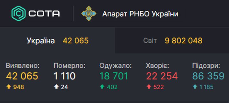 Как отмечает СНБО Украины, всего в стране с начала пандемии заболели 42065 человек.
