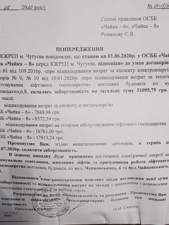 В Чугуеве Харьковской области местный жилкомхоз грозится отключить электричество и, соответственно, лифт в одной из многоэтажек из-за неуплаты долгов жителей за электроэнергию.