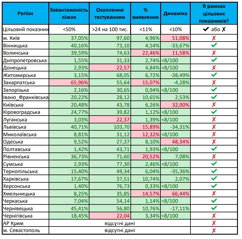 Согласно данным Минздрава, по состоянию на 28 июня показатели для ослабления противоэпидемических мер не отвечают норме в: Волынской, Донецкой, Закарпатской, Киевской, Луганской, Львовской, Николаевской, Одесской, Ривненской, Хмельницкой, Черниговской областях, а также в городе Киев.