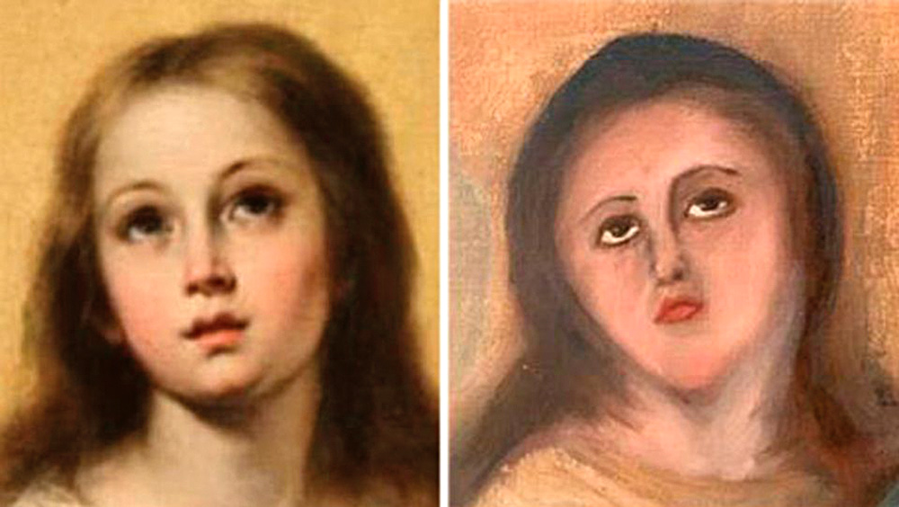 Неудачная попытка отреставрировать полотно «Непорочное зачатие», предпринятая реставратором мебели, до неузнаваемости обезобразила ангельский лик Девы Марии. Как сообщает испанское новостное агентство Europa Press, речь идет о копии работы мастера XVII века Бартоломе Эстебана Мурильо. Картина происходит из собрания частного коллекционера из Валенсии, личность которого не раскрывается. Владелец передал картину на расчистку некоему специалисту по реставрации мебели, который запросил за работу €1,2 тыс. Увидев ее после обработки, коллекционер потребовал исправить результат, но вторая попытка лишь усугубила положение. Теперь он наконец передал картину профессиональному реставратору живописи в надежде на то, что тому удастся ее восстановить, пишет heartnewspaper.