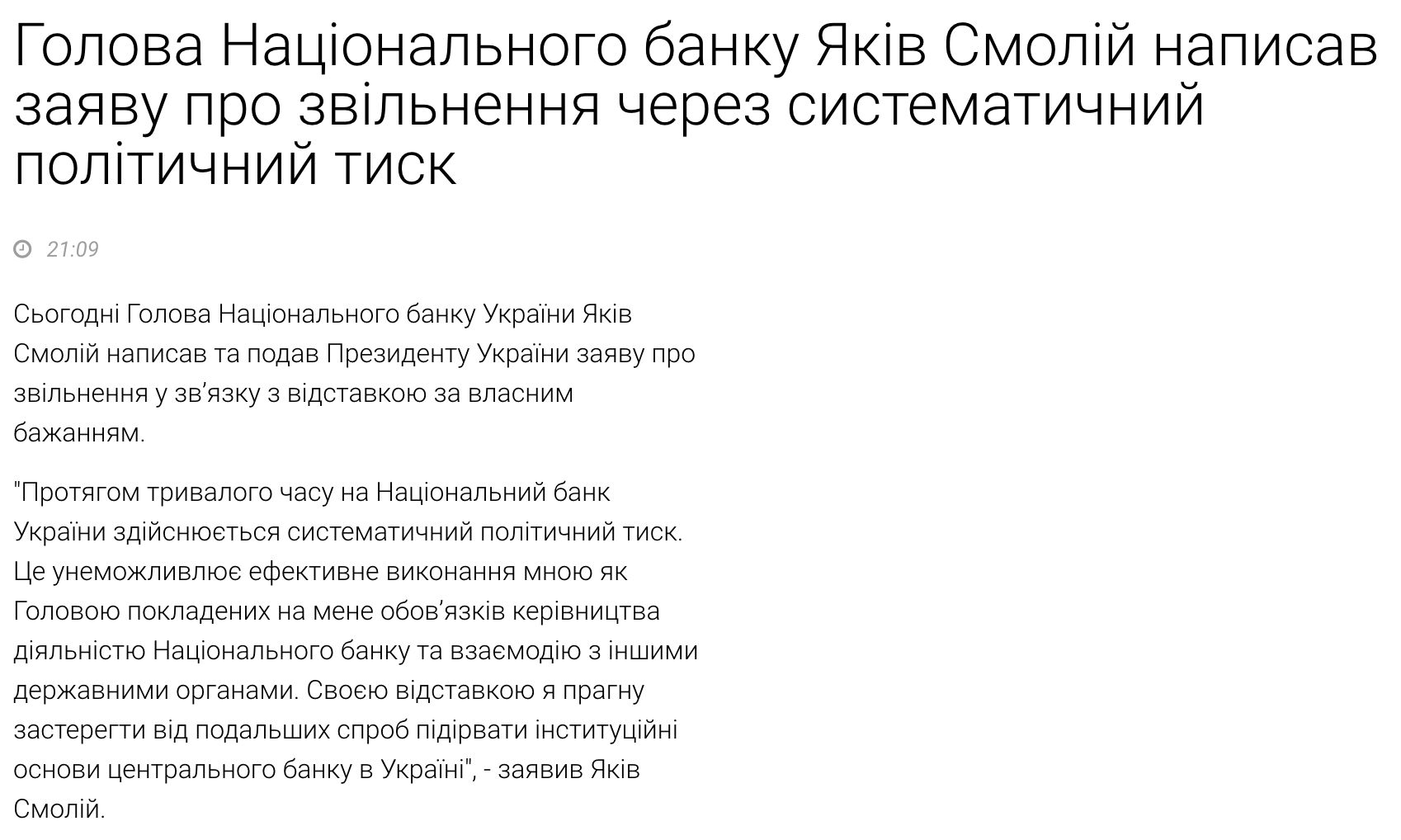 "Протягом тривалого часу на Національний банк України здійснюється систематичний політичний тиск. Це унеможливлює ефективне виконання мною як Головою покладених на мене обов’язків керівництва діяльністю Національного банку та взаємодію з іншими державними органами. Своєю відставкою я прагну застерегти від подальших спроб підірвати інституційні основи центрального банку в Україні", - заявив Яків Смолій.