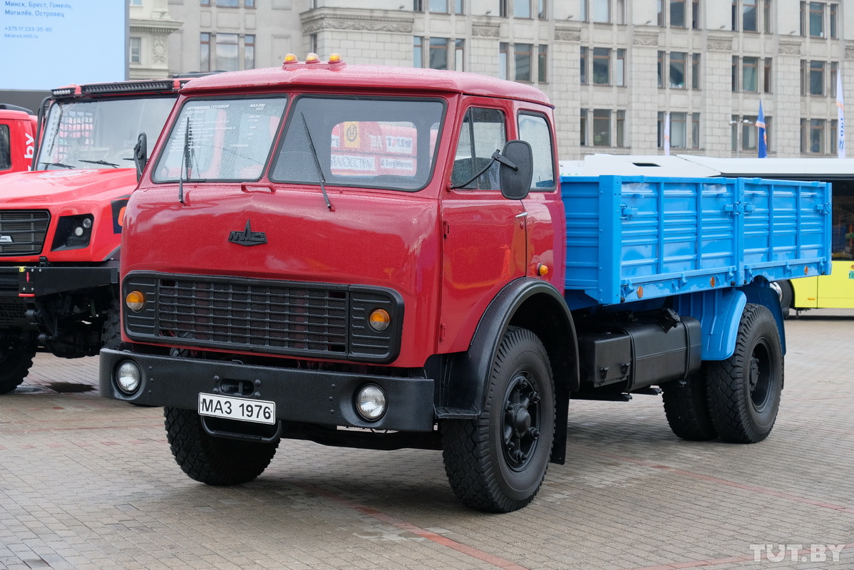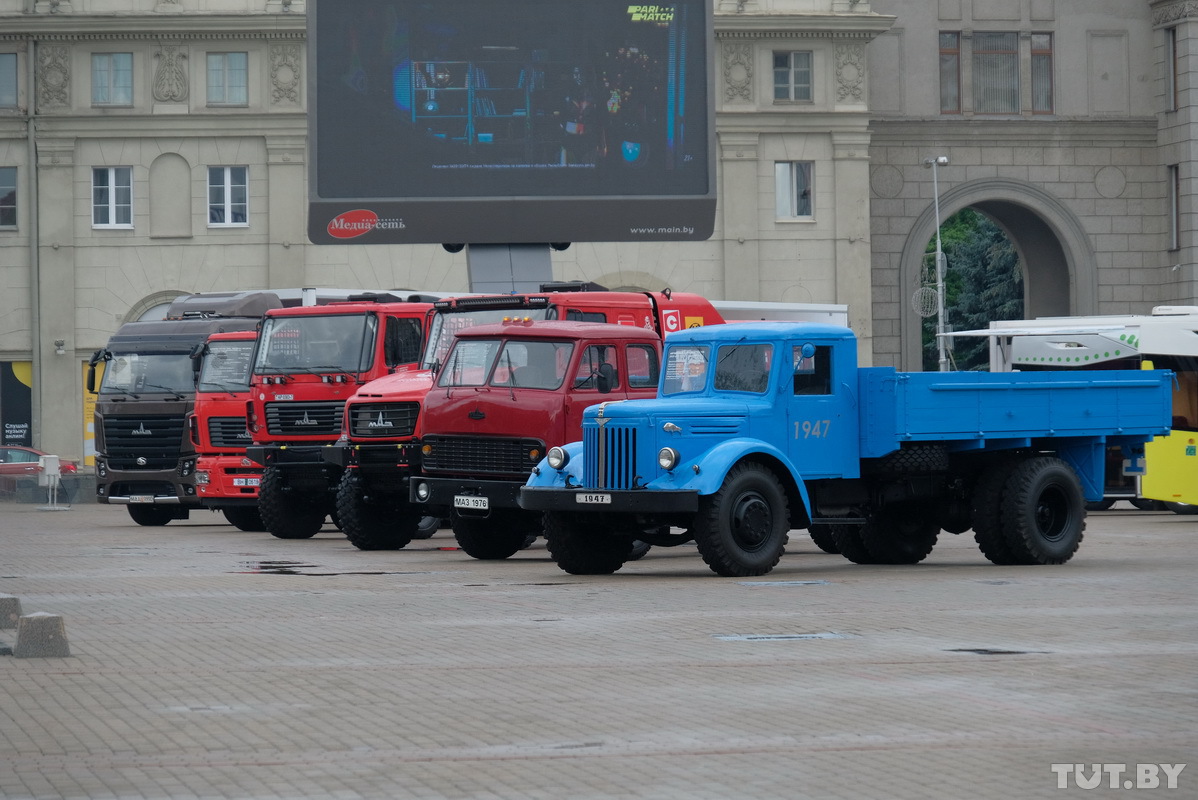 МАЗ тоже выкатил на обозрение публике две ретро-модели. Голубой грузовик на переднем плане — это первая в истории завода модель МАЗ-200. Была выпущена в 1947 году.
