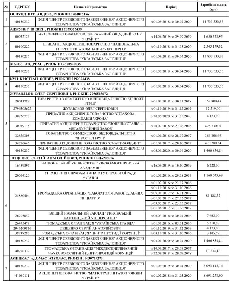 "Доходы членов наблюдательного совета Укрзализныци. Той Железные дороги, которая перешла на 4-дневную работу, той, где дырявые поезда, той, которая закрывает сортировочные станции и освобождает 70 тысяч железнодорожников, той, которая на грани банкротства", - написала она в Facebook.